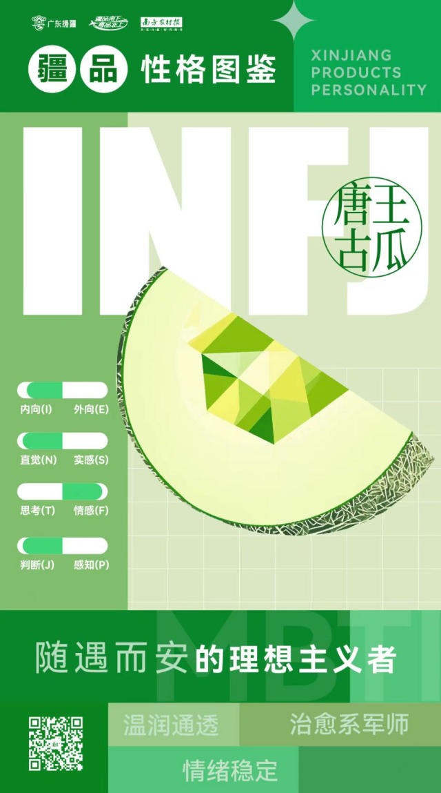 瓜果飘香的季节,走进第三师图木舒克市,古瓜空气独存一份沁凉清甜。灵魂寻香望去,疆甜疆品田垄间挂满枝头的性格唐王古瓜,是唐王图这份清甜的源头,更鲜活诠释着INFJ的古瓜性格底色。